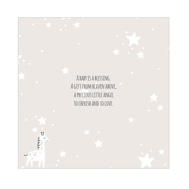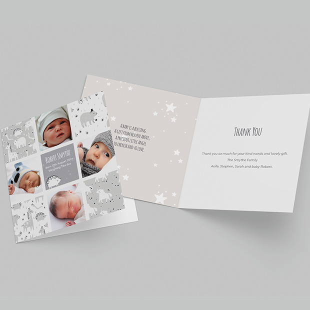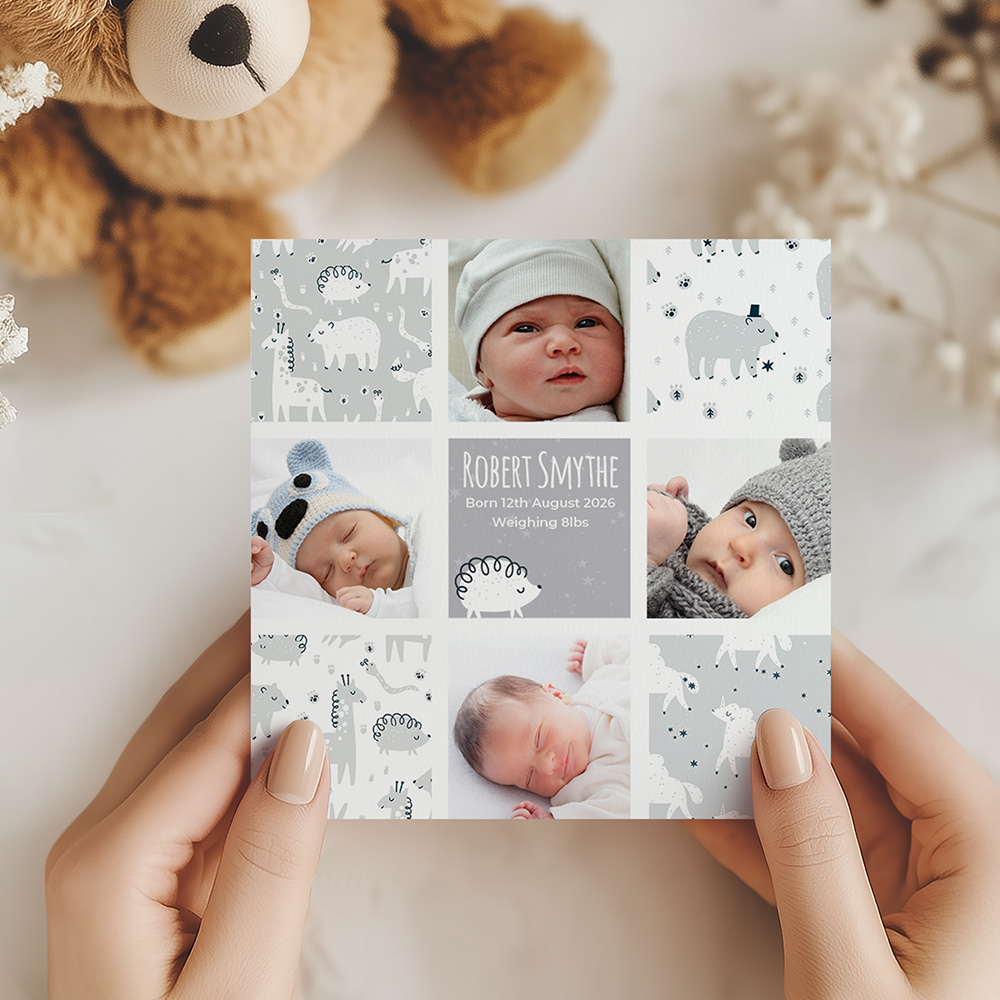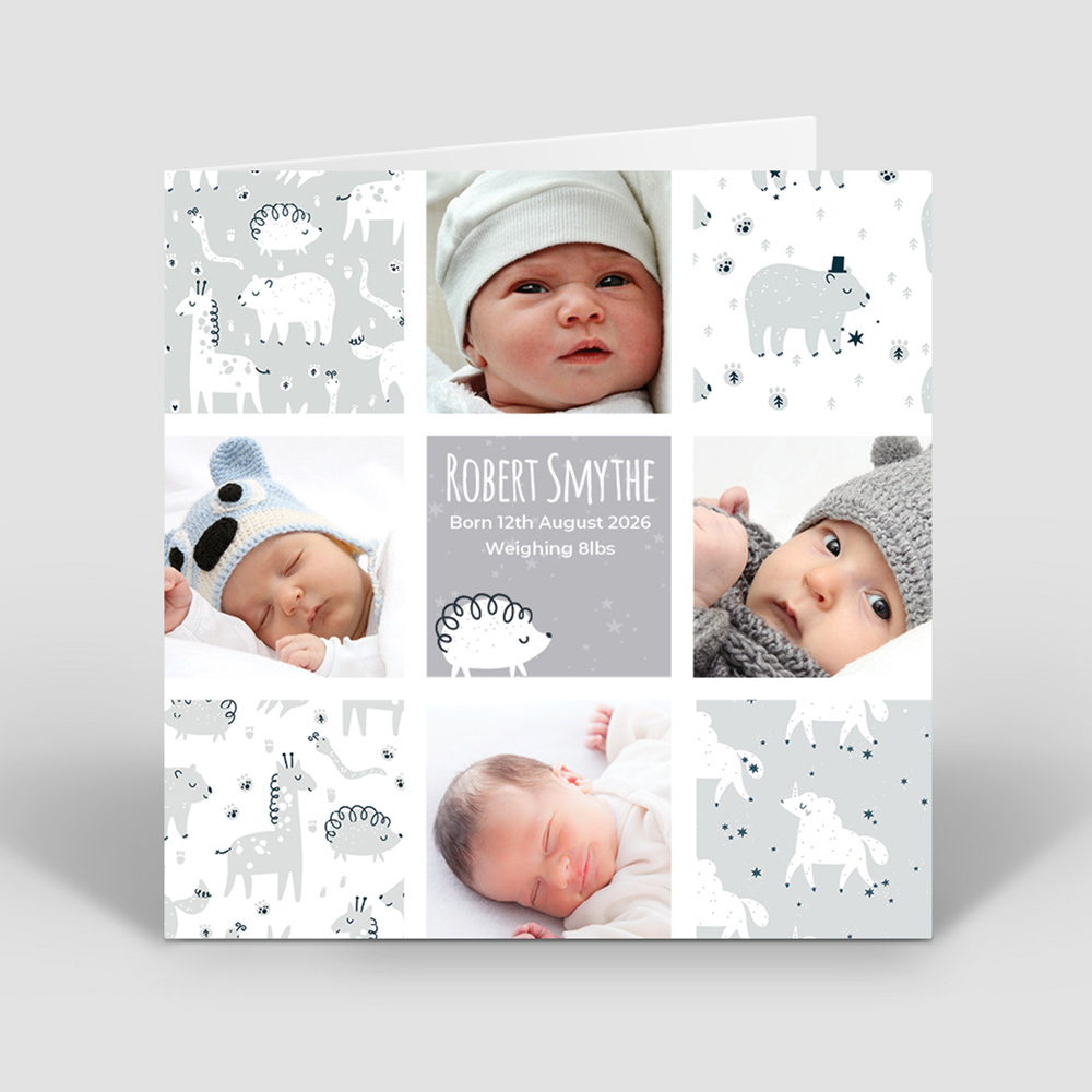 A very sweet baby thank you card for boys that allows for four photo uploads. Featuring some cute animal patterns. Format: Folded Square