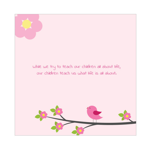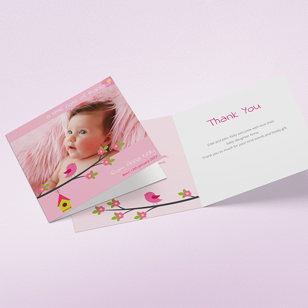 A really sweet baby thank you card featuring a single photograph and a baby bird illustration against a pink background.