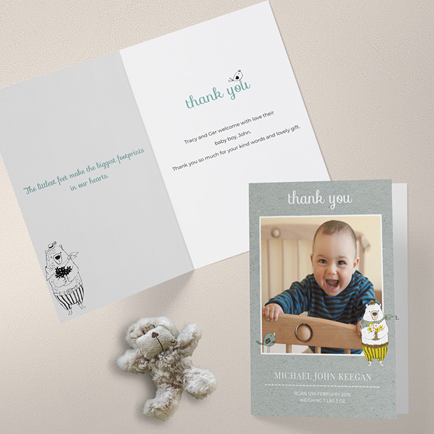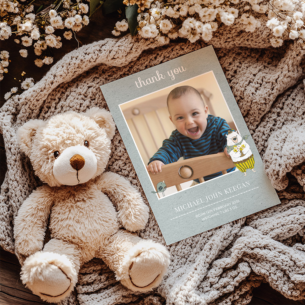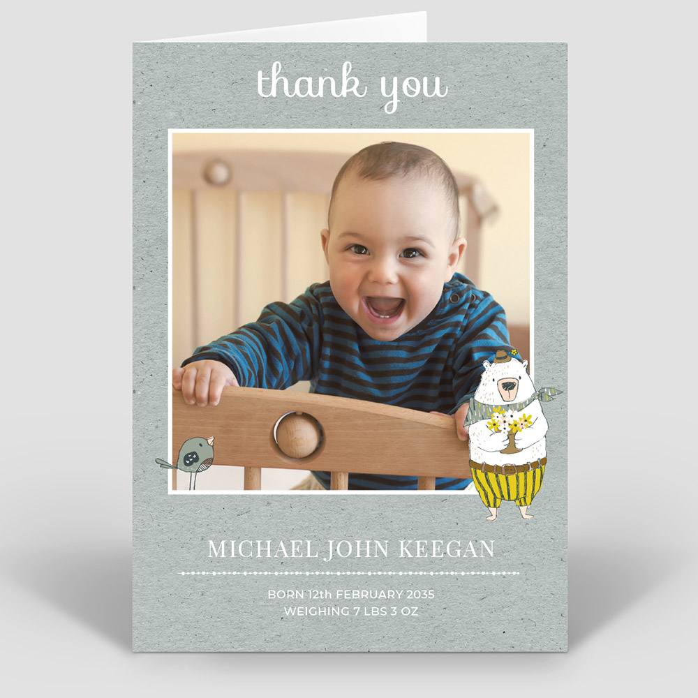 This card features an ‘earthy’ feel with a textured paper effect background. The cutest illustrations of a friendly bear and bird along with your baby photo makes this card design adorable. Format: Folded Rectangle