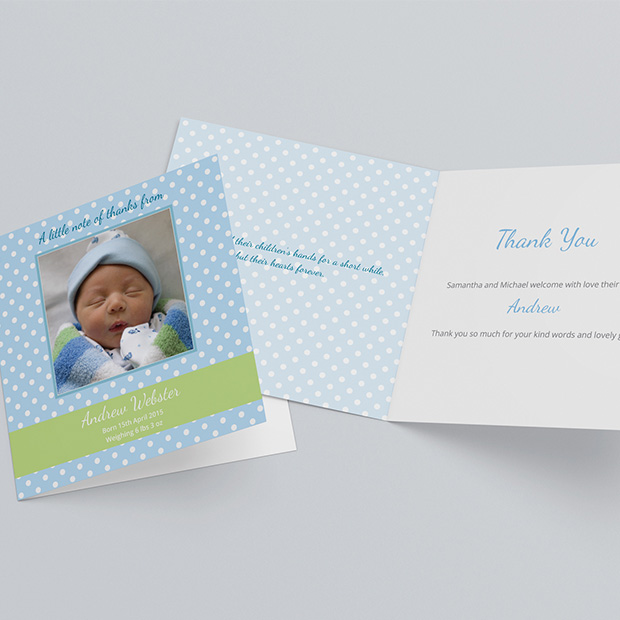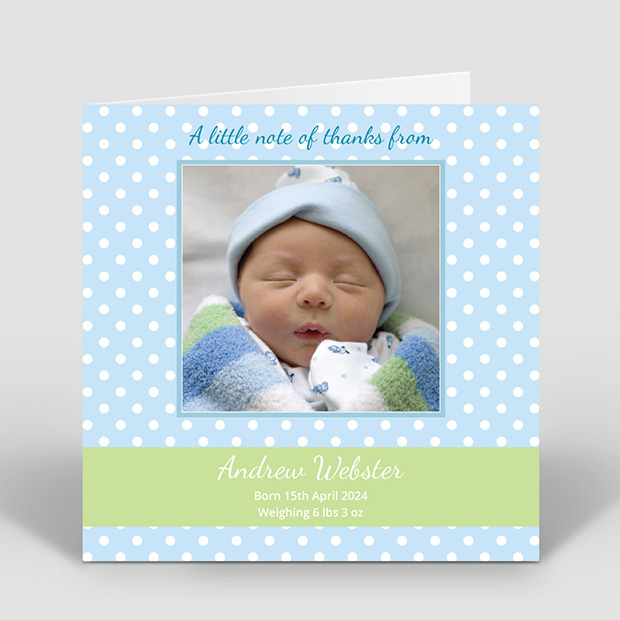 The simplest design very often makes for the cutest baby thank you card. Classic blue polka dots makes for a lovely backdrop for your son’s photograph. Format: Folded Square