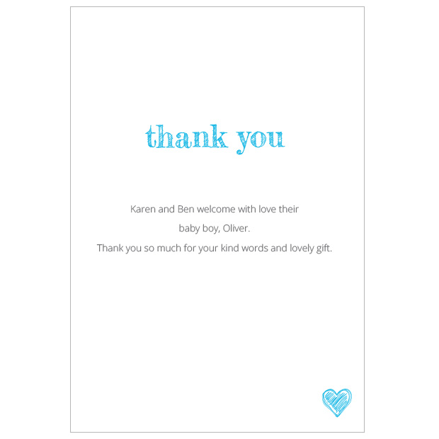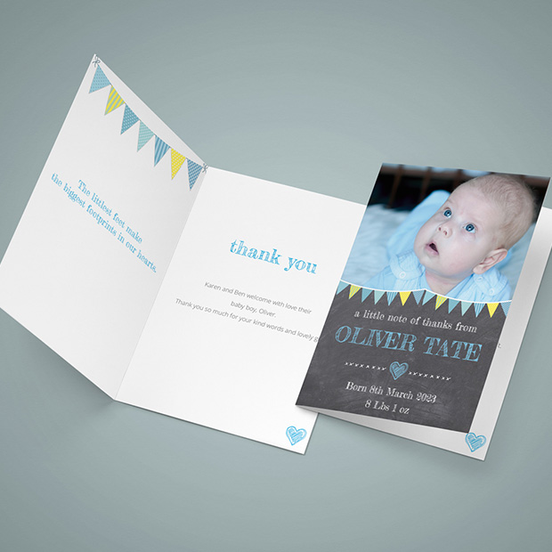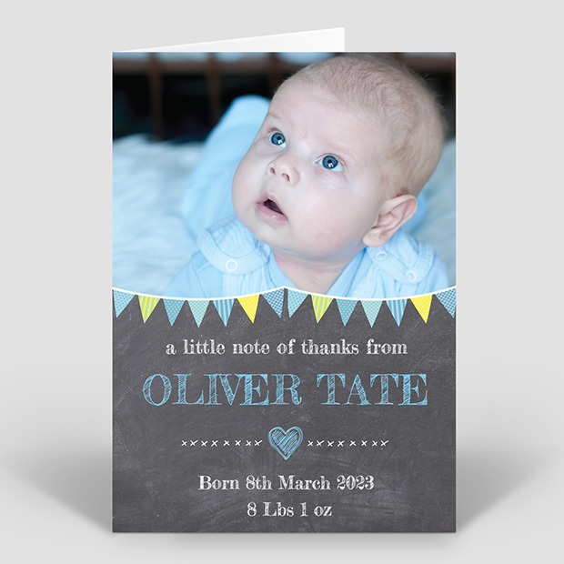 This baby thank you card features a fun modern design with a popular chalkboard style artwork. Supplied in two formats, ideal for landscape and portrait oriented photos.