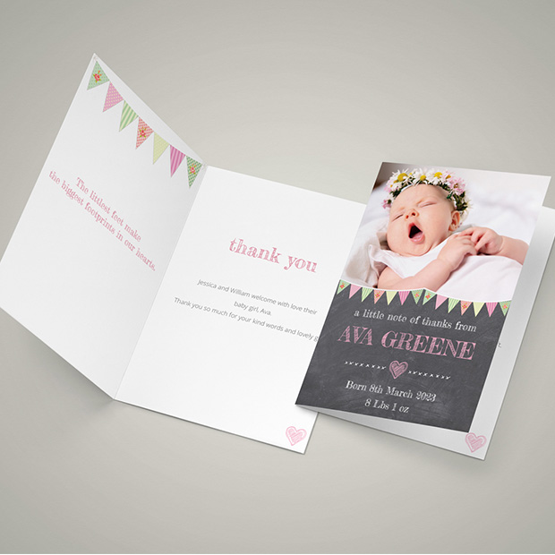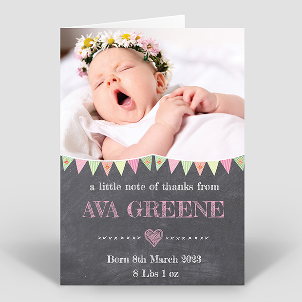 This baby thank you card features a fun modern design with a popular chalkboard style artwork. Supplied in two formats, ideal for landscape and portrait oriented photos.