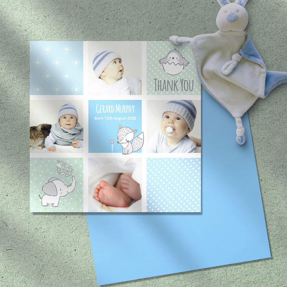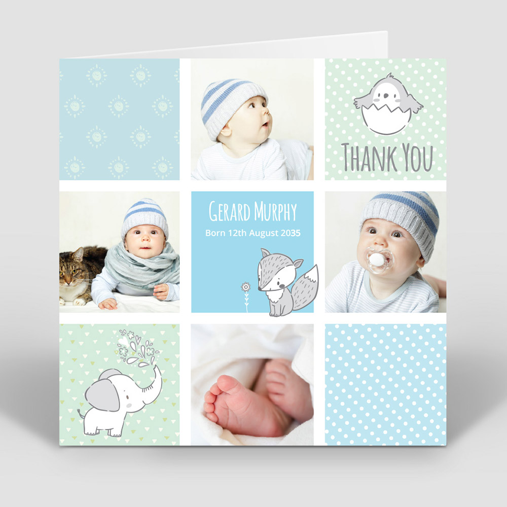 A sweet little card that allows for four photo uploads. Featuring some very cute comic style creatures. Comic Book – baby thank you card for boys. Format: Folded Square