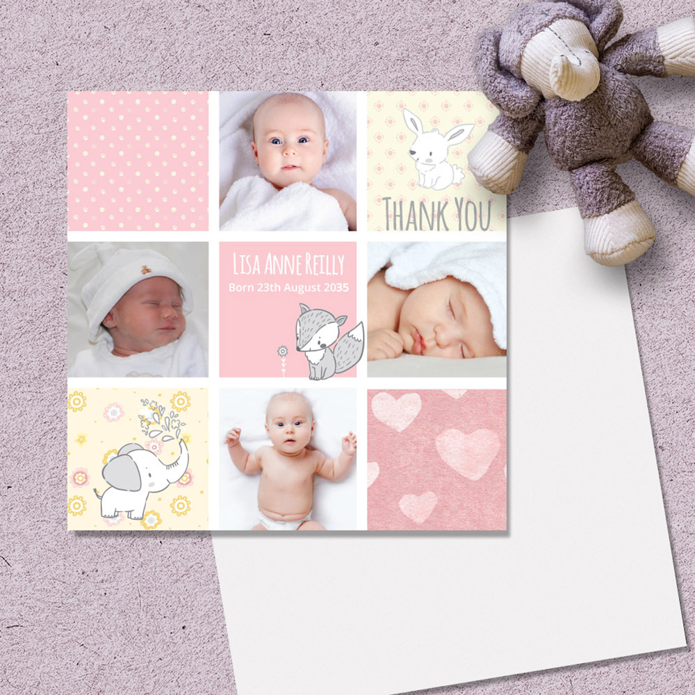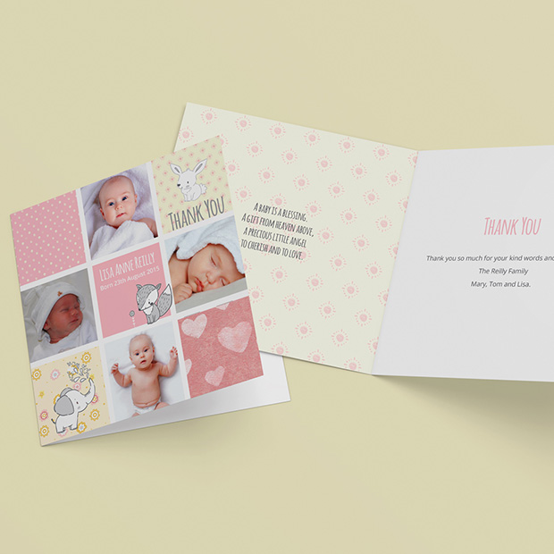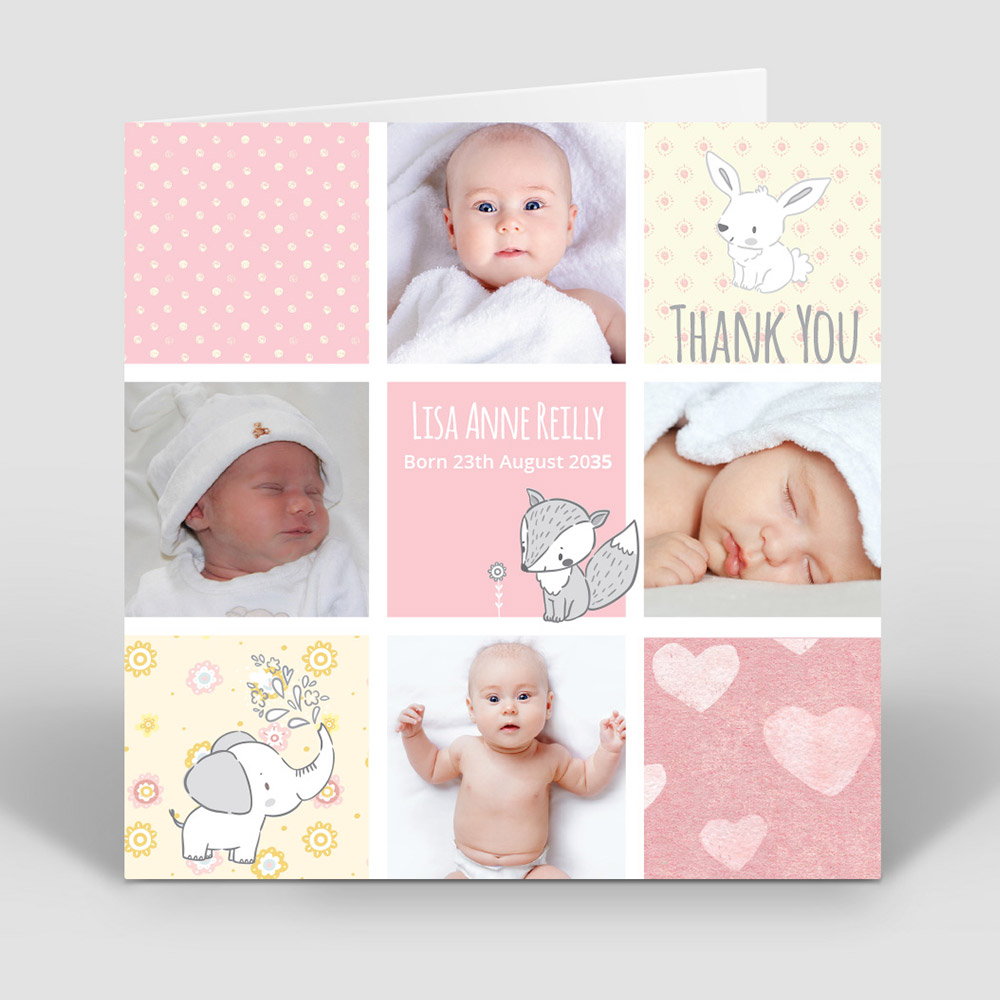 A sweet little card that allows for four photo uploads. Featuring some very cute comic style illustrations. Comic Book – baby thank you card for girls. Format: Folded Square