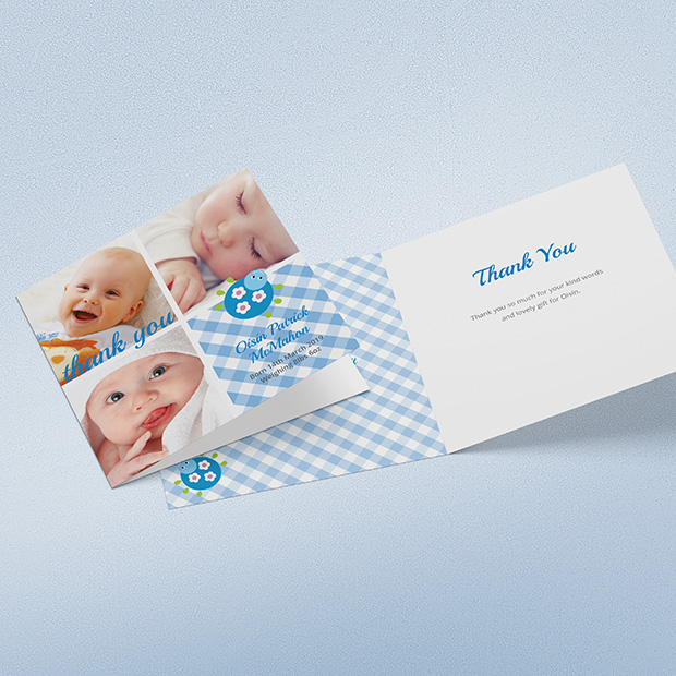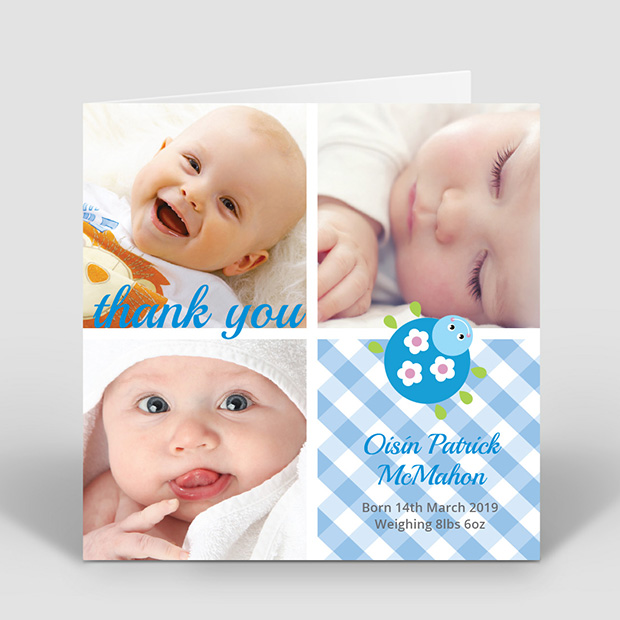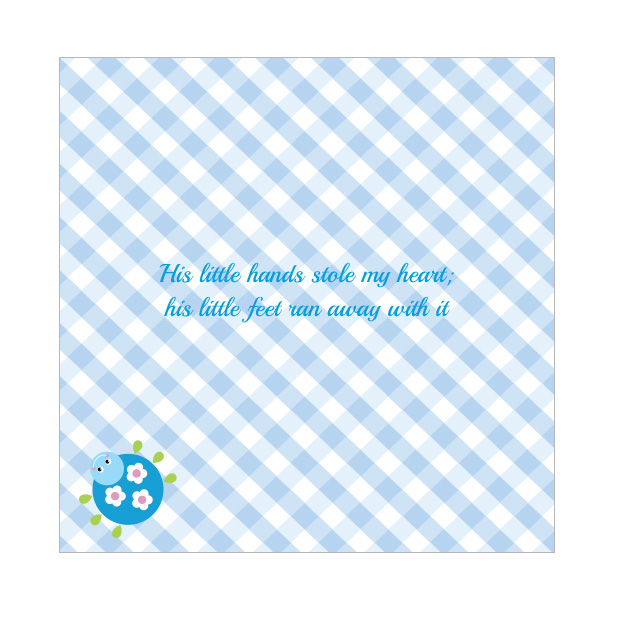 A three photo template design featuring a baby blue check pattern and a ‘cute bug’ illustration supplying the fun! Format: Folded Square