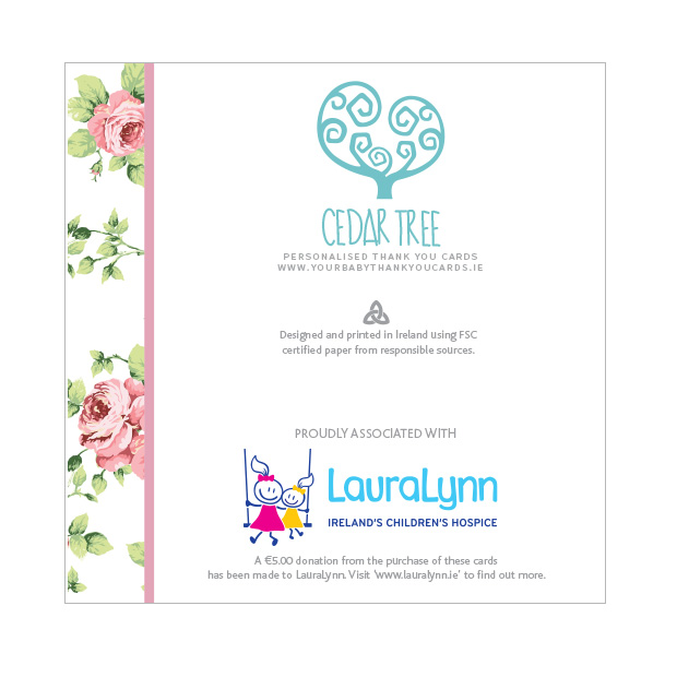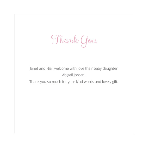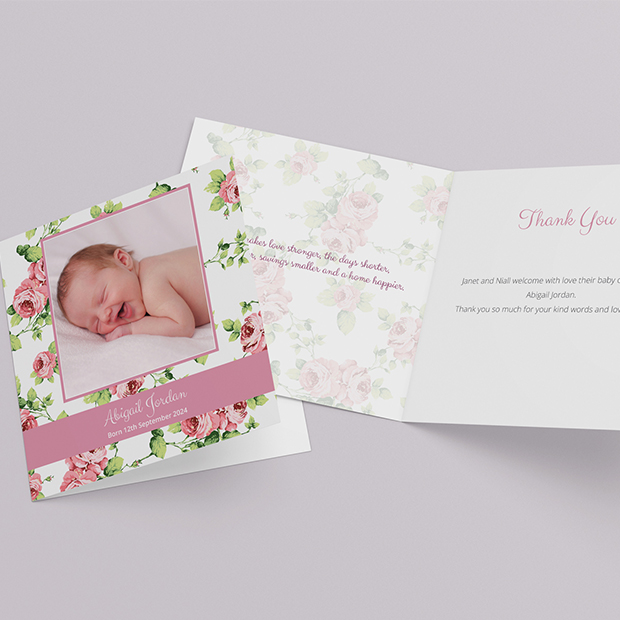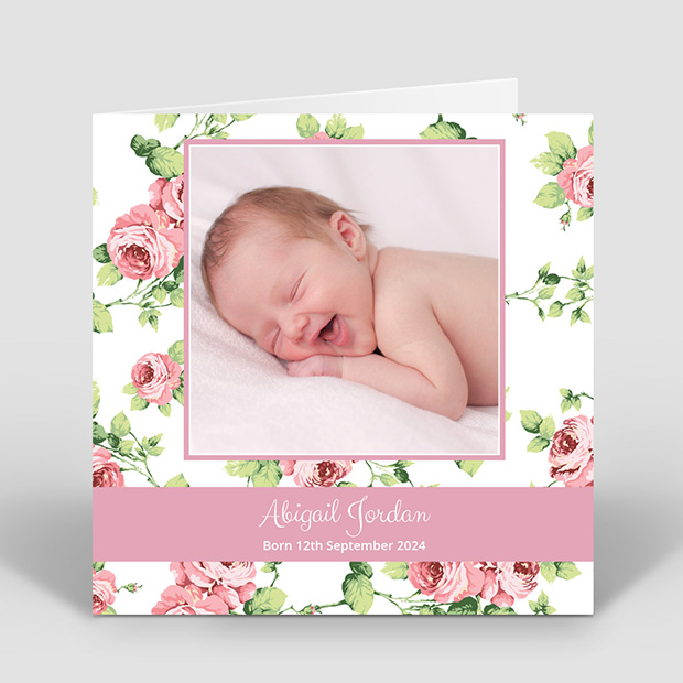 The vintage look is very popular at the moment and this card echoes that retro vibe. A lovely, tasteful card featuring one photo of your new daughter set against peach and pink roses. Garden View – baby thank you card for girls. Format: Folded Square
