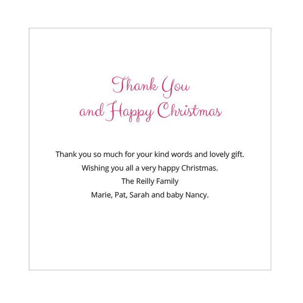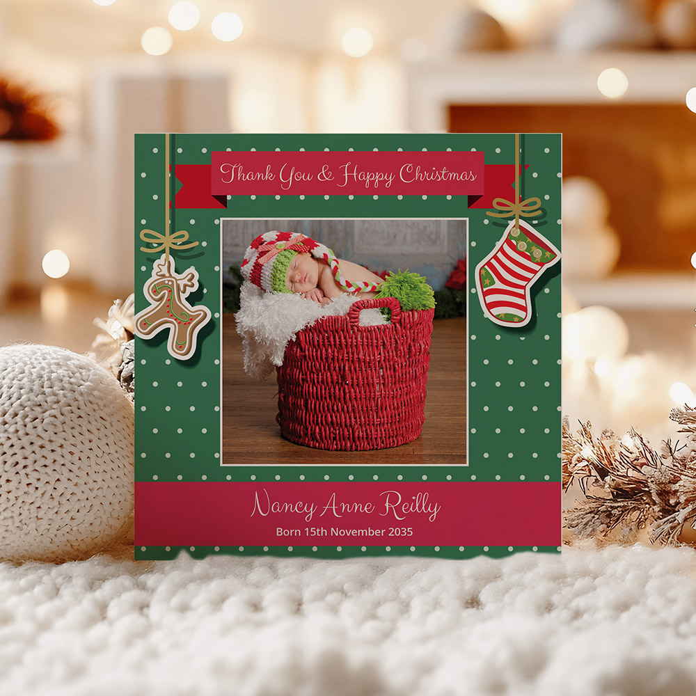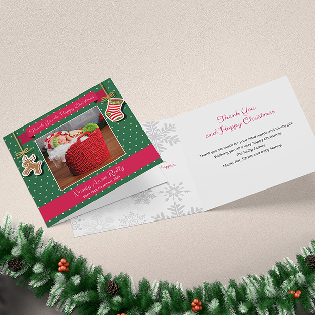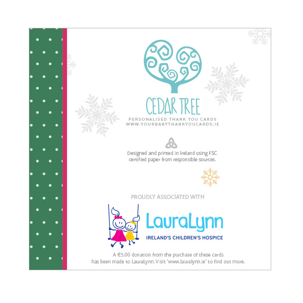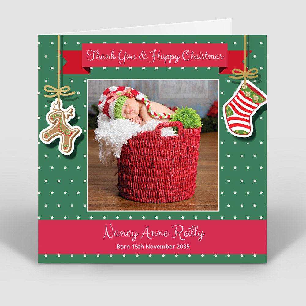 Christmas themed baby thank you card by Cedar Tree Ireland. Say thank you and Happy Christmas with this lovely seasonal design for both boys and girls. Format: Folded Square