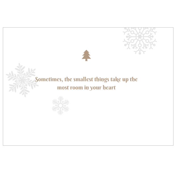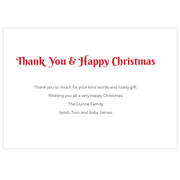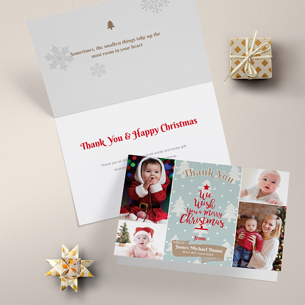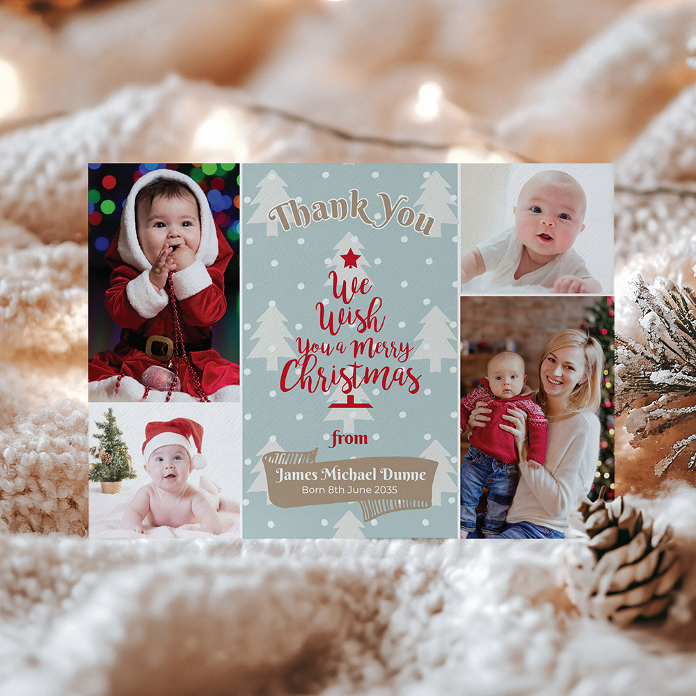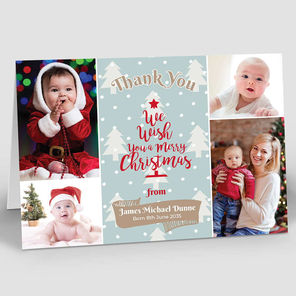 Christmas themed baby thank you card by Cedar Tree Ireland. Say ‘thank you’ and ‘Happy Christmas’ with a single card with this lovely seasonal unisex design. ‘Oh Christmas Tree’ features a snow scene and stylized ‘We Wish You A Merry Christmas’ sentiment. This design features 4 photos. Format: Folded Landscape