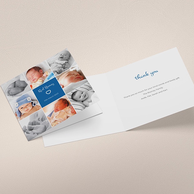 If you have a number of baby photos that you wish to use within a design, this card is an excellent option allowing for eight image uploads. Format: Folded Square