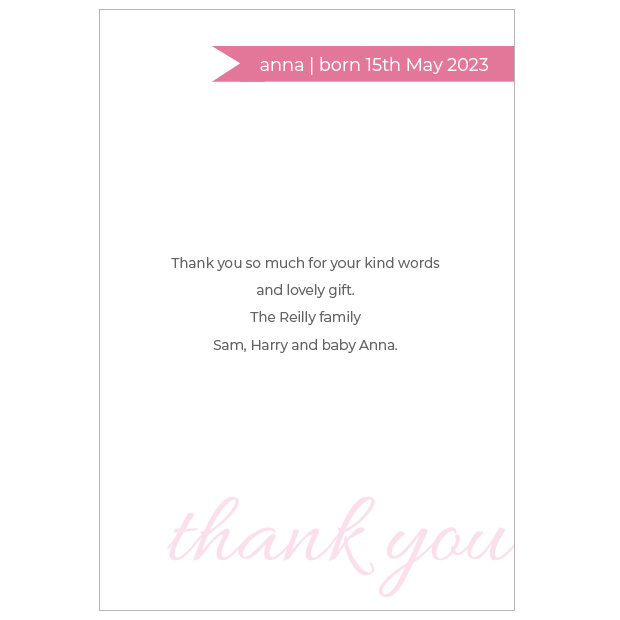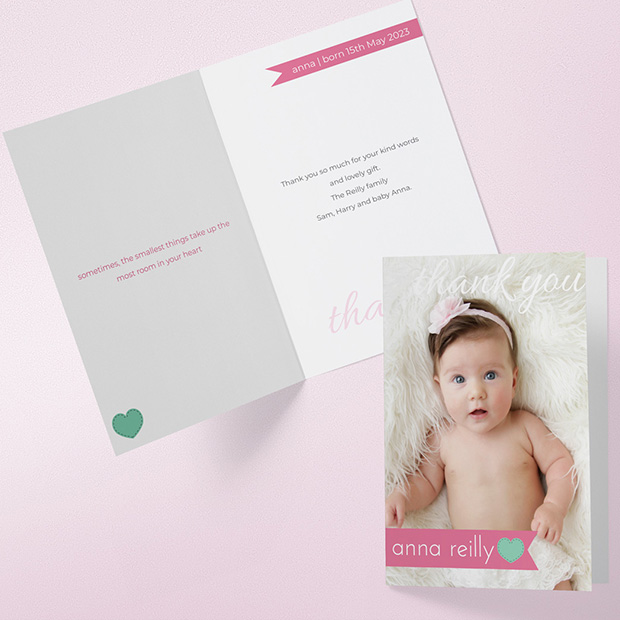 The ‘simple things’ in life are the best. A lovely baby thank you card featuring a single photo of your baby girl. The message ‘thank you’ is faintly printed with a dusky pink ribbon background for her name to appear next to a patchwork heart.