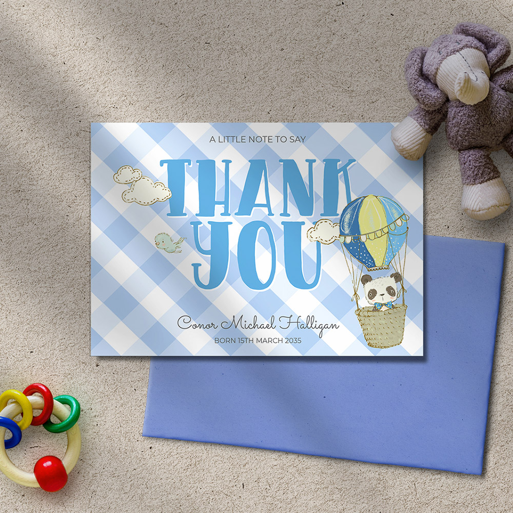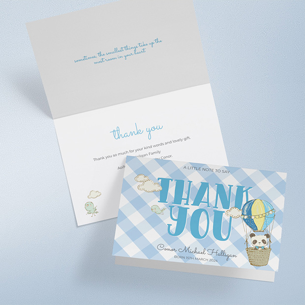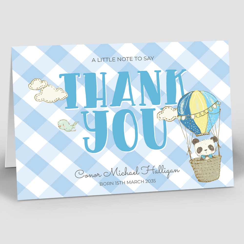 A fun design featuring a cute ballooning Panda with the ‘thank you’ sentiment in bold blue. Format: Folded Landscape.